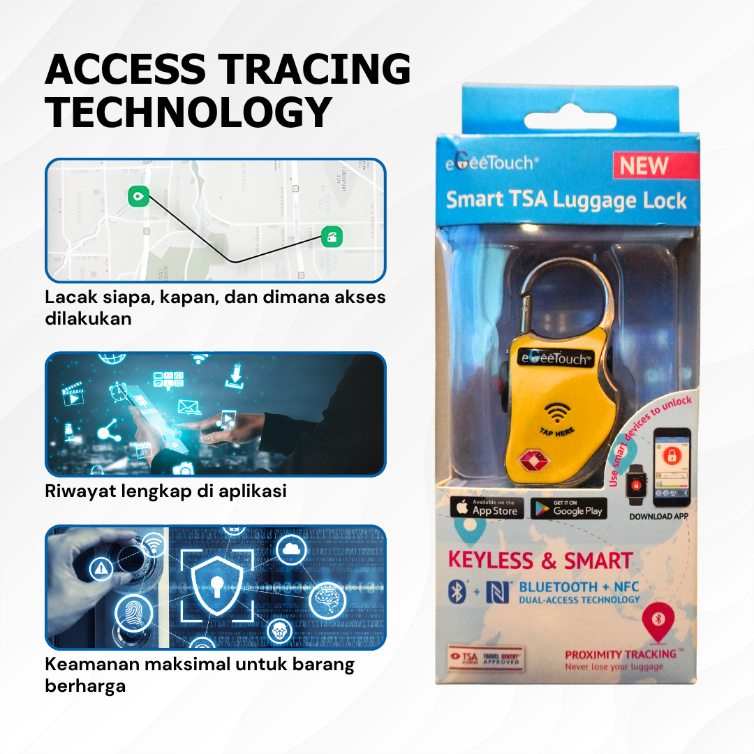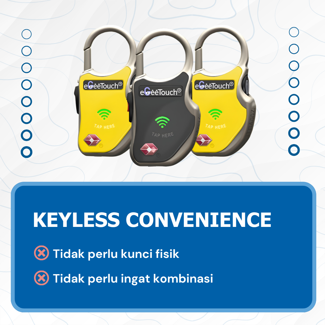 PERBANDINGAN eGeeTouch SMART LOCK USA dengan GEMBOK BIASA: Kunci bisa hilang/tercopy, Tidak ada riwayat akses Rentan dipotong/dibobol, Management manual Kualitas tidak terjamin, Teknologi sederhana Tidak ada sertifikasi, Garansi terbatas   eGeeTouch SMART LOCK USA: -Keyless – buka dengan HP -Access history lengkap -Anti-cut & tamper alert -Cloud management -Kualitas Amerika terbukti -Teknologi paten AS -Sertifikasi internasional -Garansi resmi 1 tahun